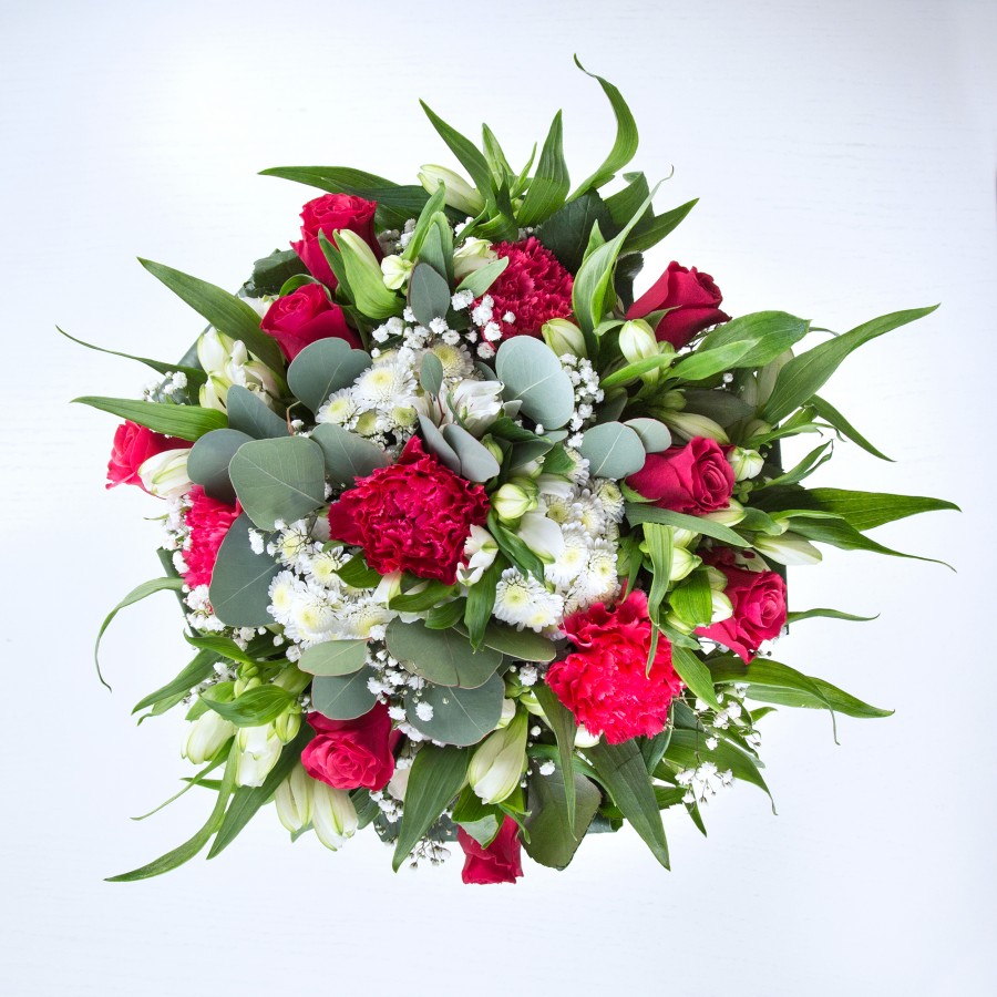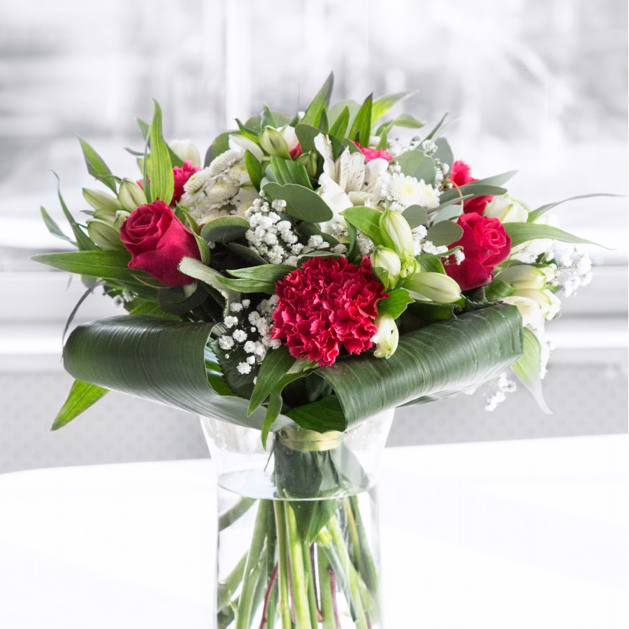 Embrace the timeless elegance of our Timeless Beauty Bouquet. Featuring classic red roses intertwined with pristine white chrysanthemums and delicate gypsophila, this arrangement is enhanced with white alstroemeria and lush aspidistra leaves.
